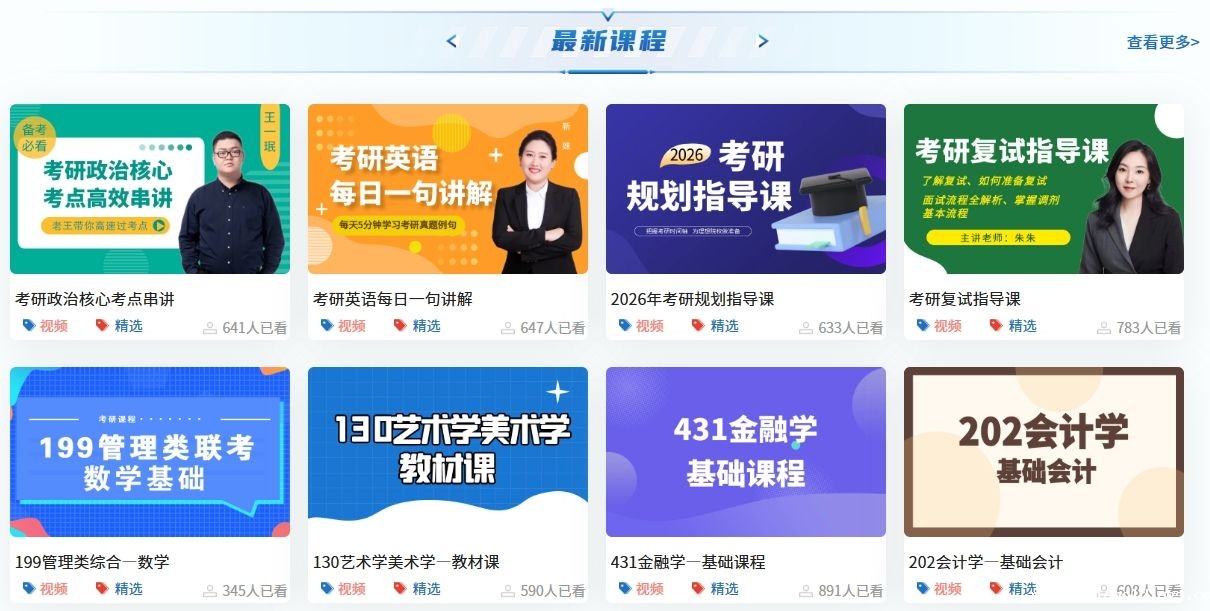 7200+考研课程资源:学习平台涵盖考研各个学科各个阶段的课程学习,同学可按考研课程体系按部就班有计划学习,也可搜索薄弱学科进行有针对性的学习,无论是刚刚准备考研的大学生,还是处于复习阶段冲刺的大学生,都可匹配合适考研课程,助力考研。